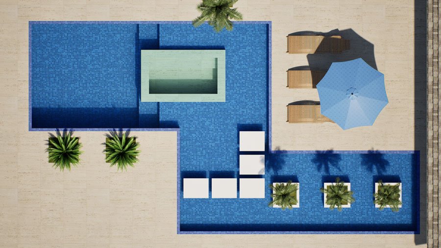 Modelo de piscina alto padrão Celeste: Exclusividade e elegância com múltiplos níveis, ilha SPA em travertino e design único.